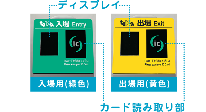 簡易TOICA改札機は、入場用(緑色)と出場用(黄色)があります。