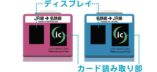 ICのりかえ改札機は、名鉄線/愛環線乗車時用(ピンク色)、 名鉄線/愛環線降車時用(水色)があります。